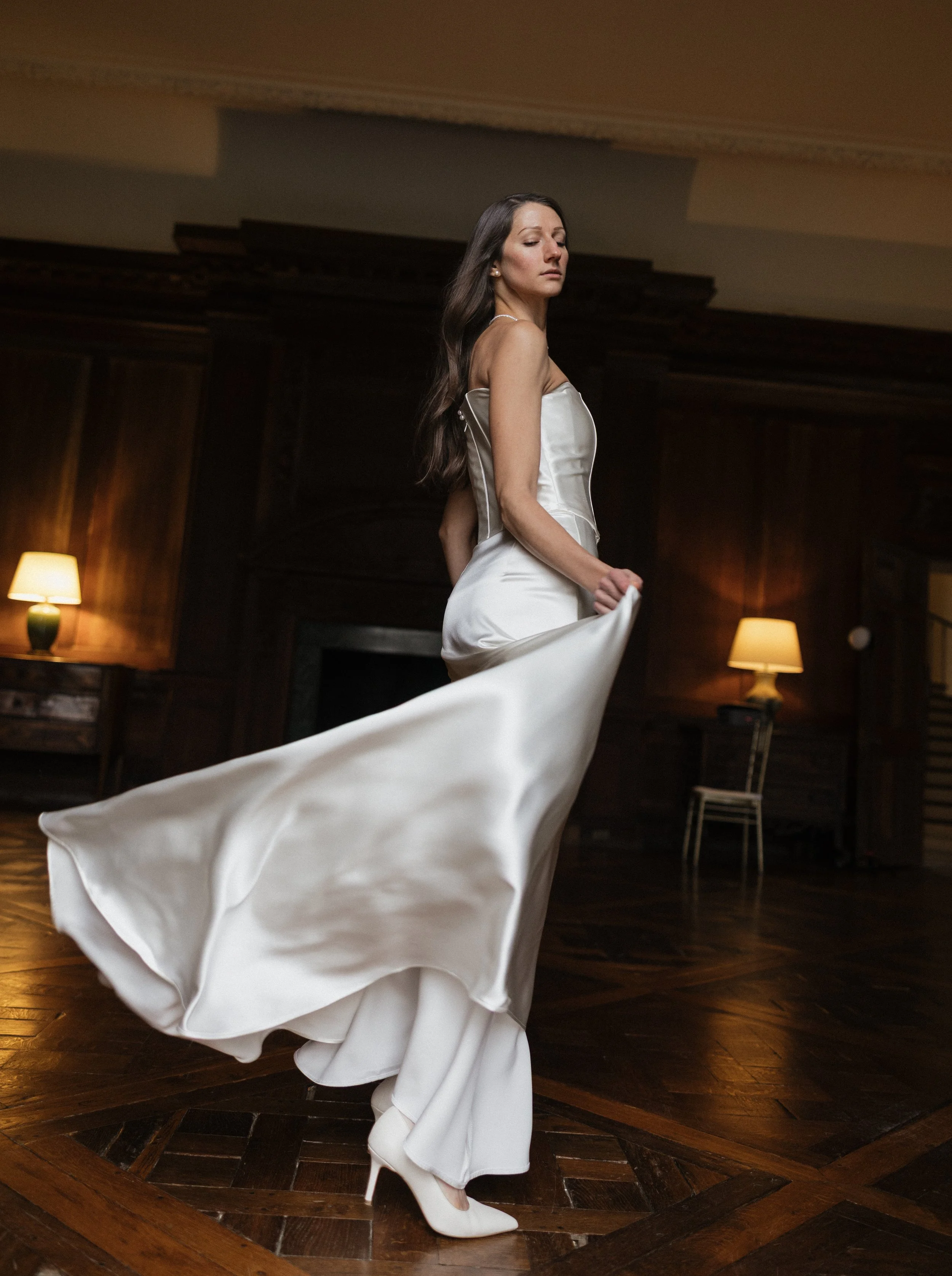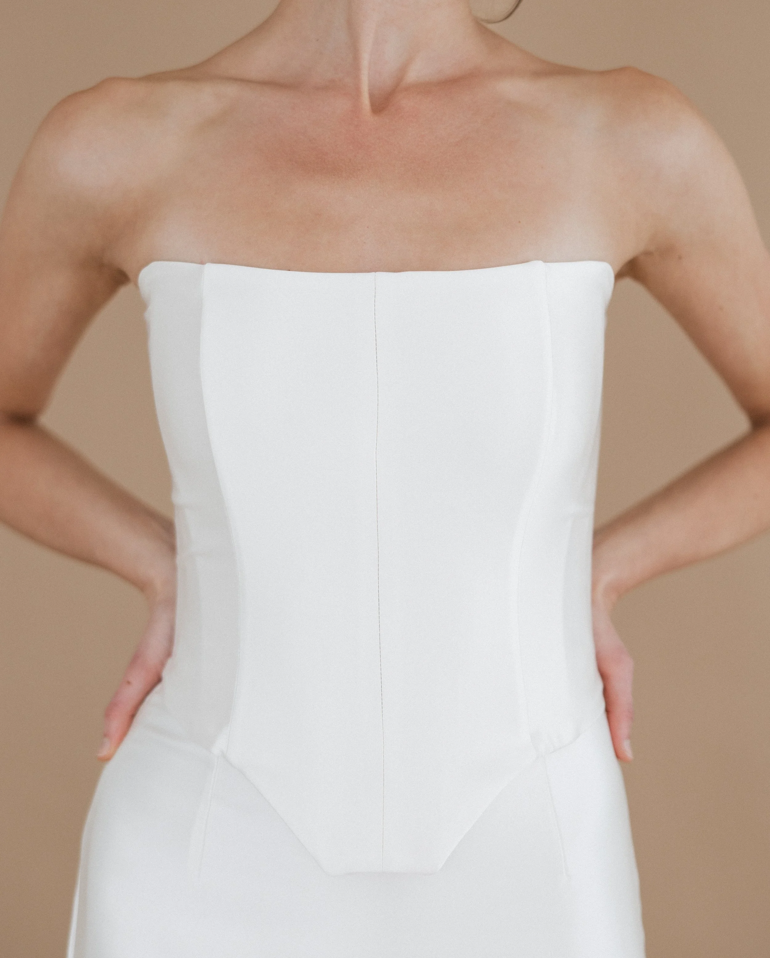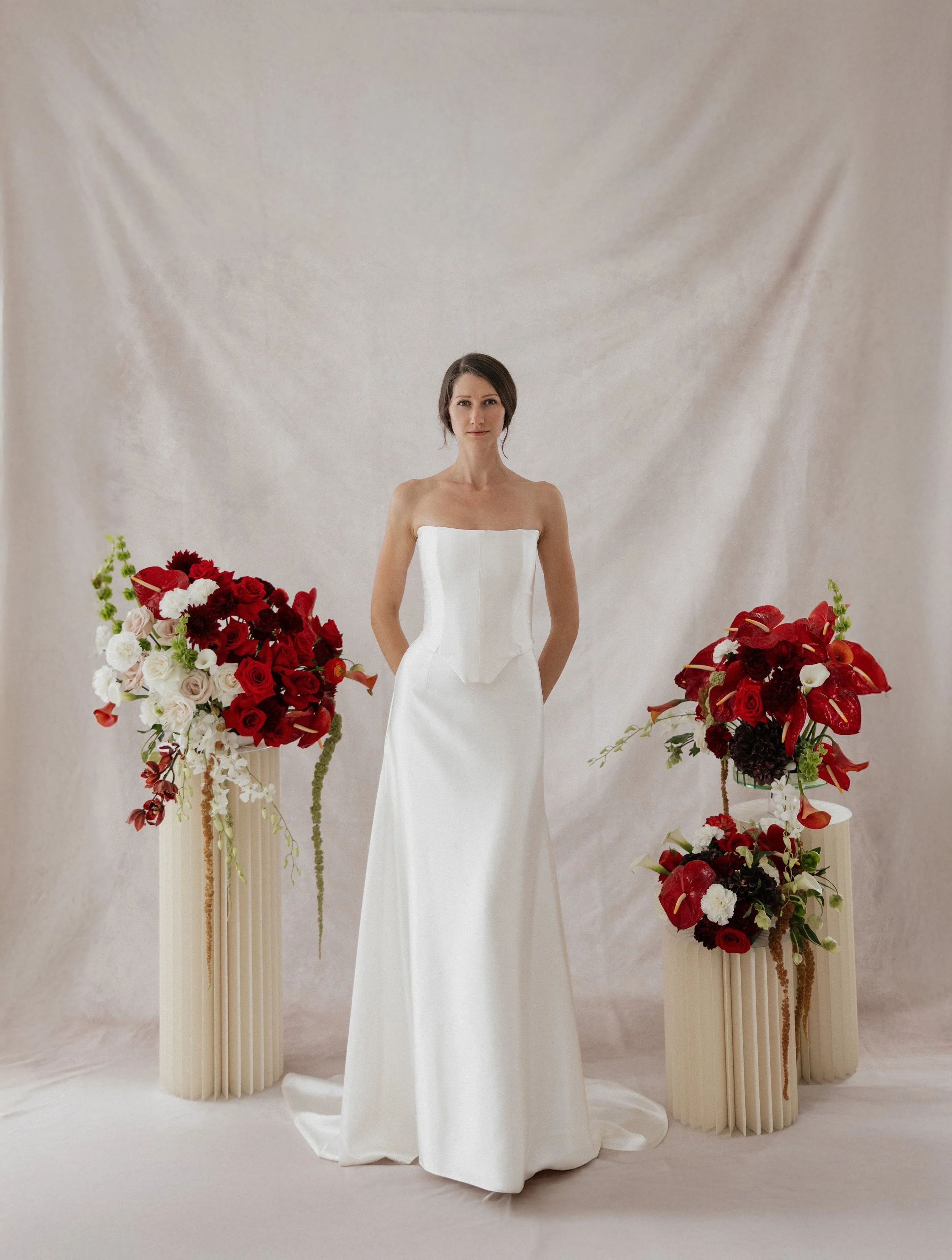 Flora Stone Court is an ivory, silk, crepe-satin gown featuring a fully boned corset top and separate floor length, light a-line cut skirt. Lined with a 100% silk charmeuse.