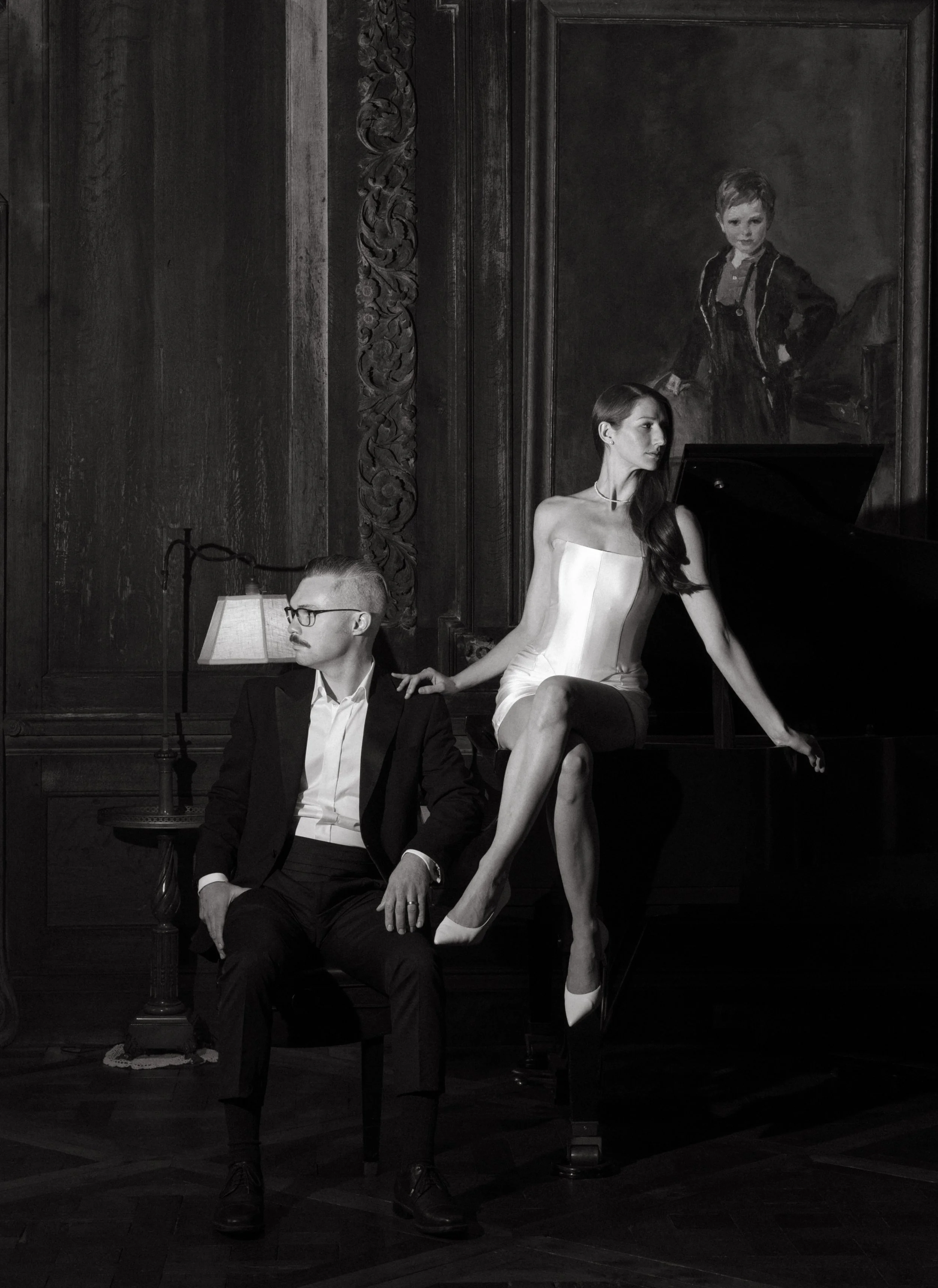 The corset bodice features a square cut basque waistline and is heavily boned for a traditional, high structural fit. It is adorned with two freshwater pearl buttons in the back.