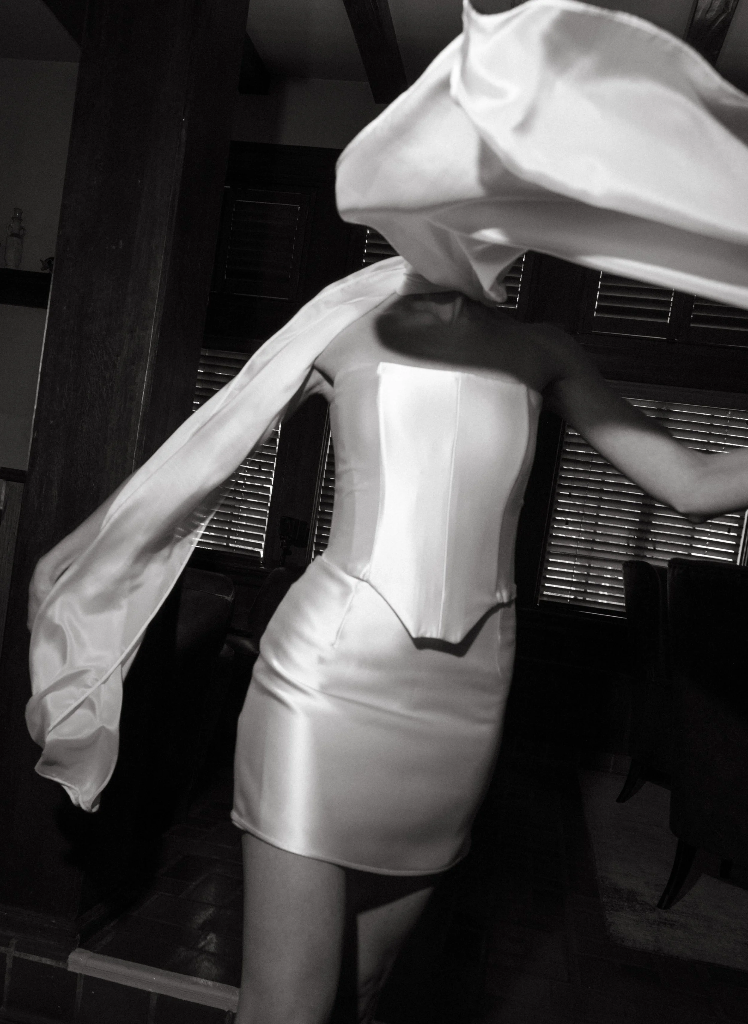 The Good Morning Silk Scarf is an off-white, semi-translucent, silk, flat-crepe scarf with a soft sheen.