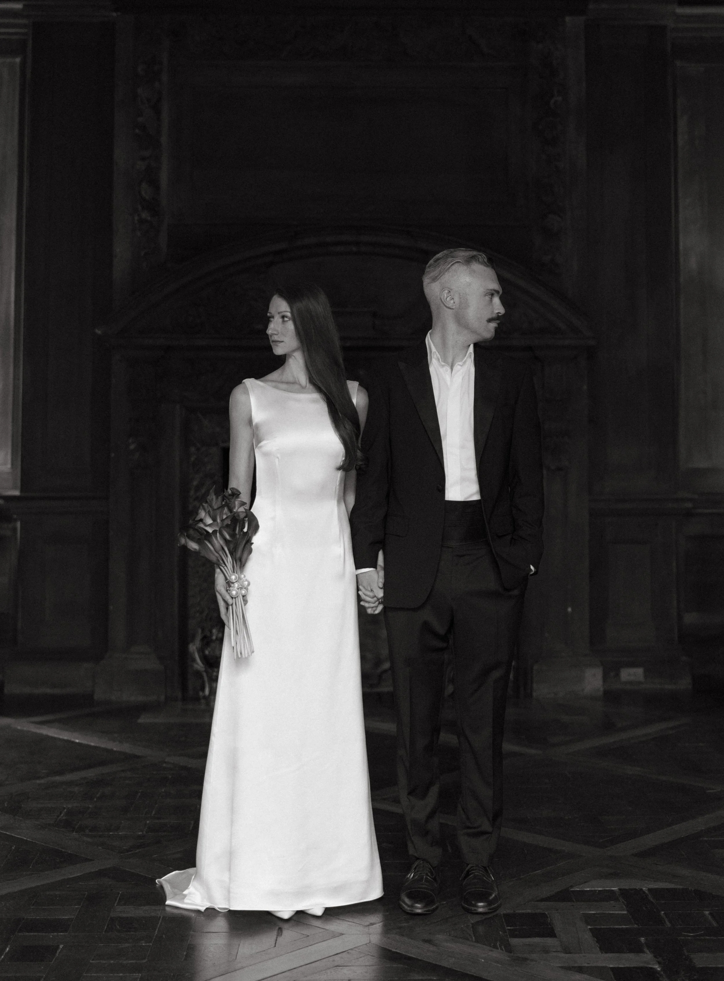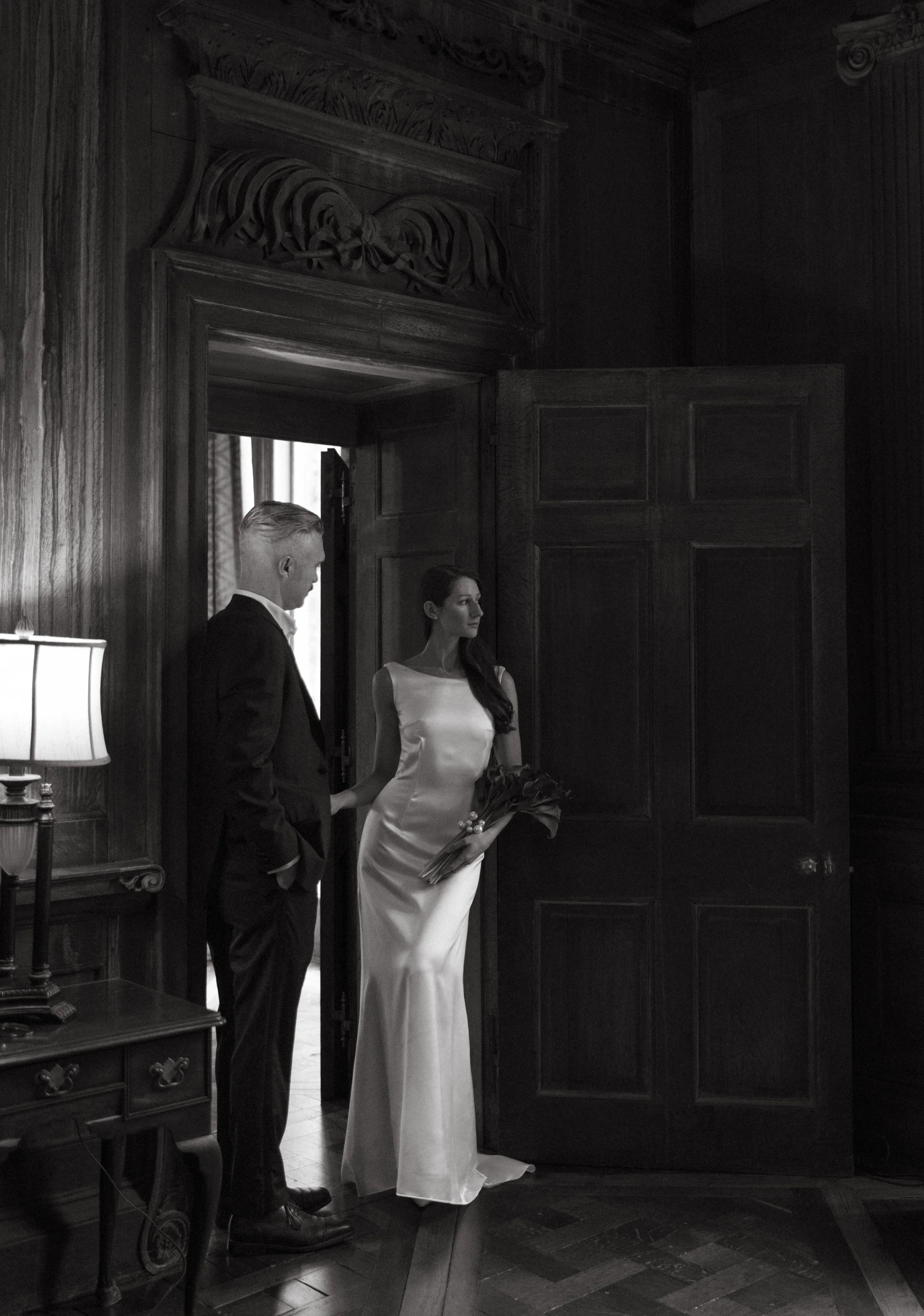 Harbor Avenue is an ivory, silk, crepe-satin gown with a high neckline and delicate v-backline.