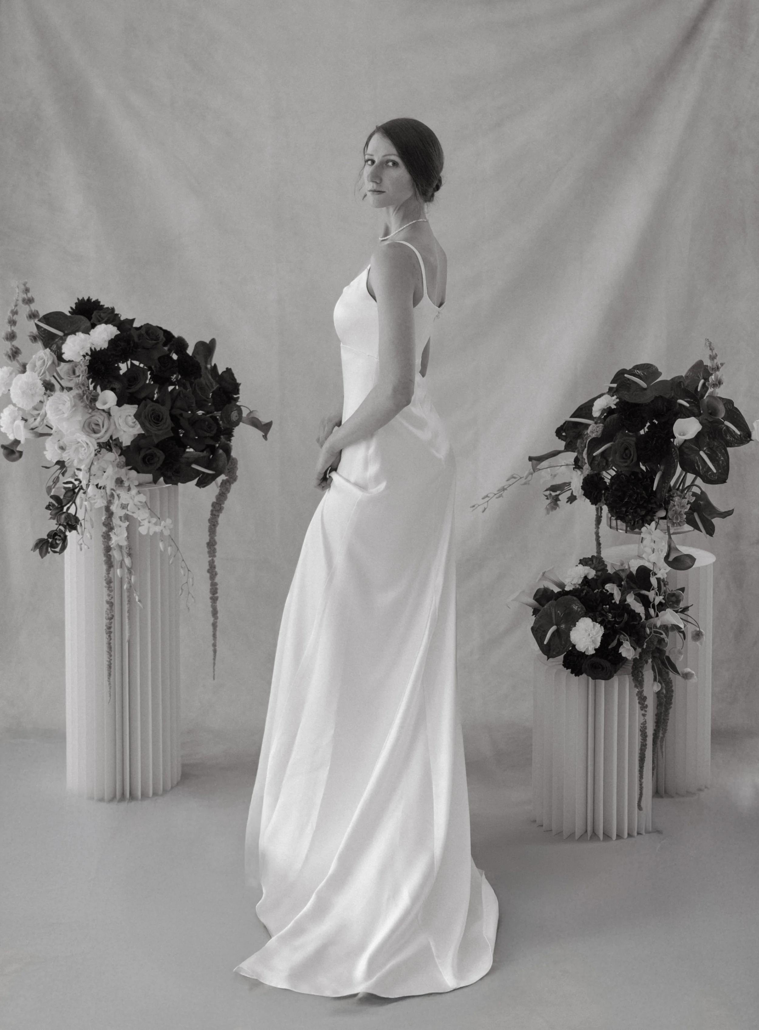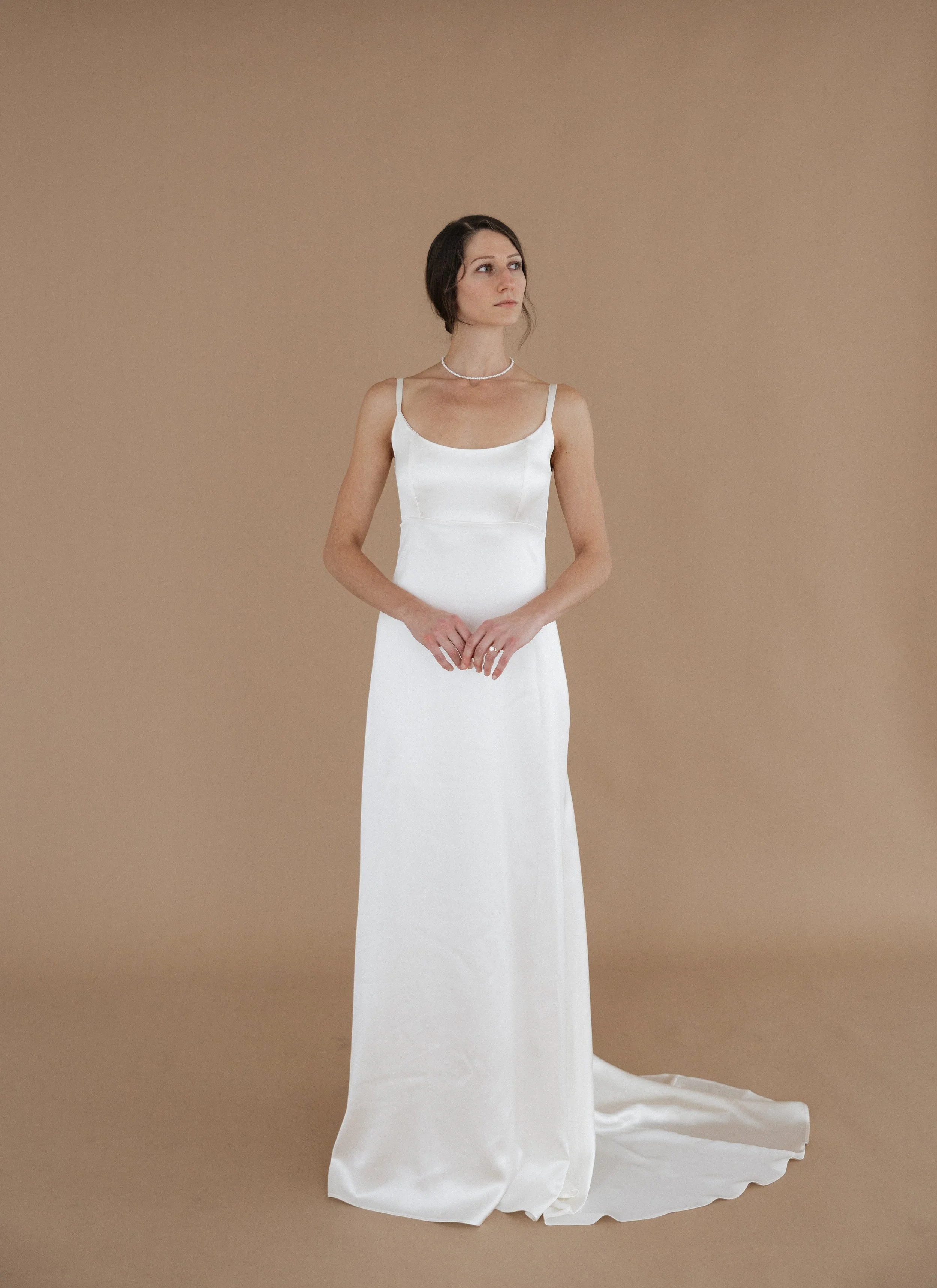 Italia Vineyard is an ivory, silk, crepe-satin slip style gown.