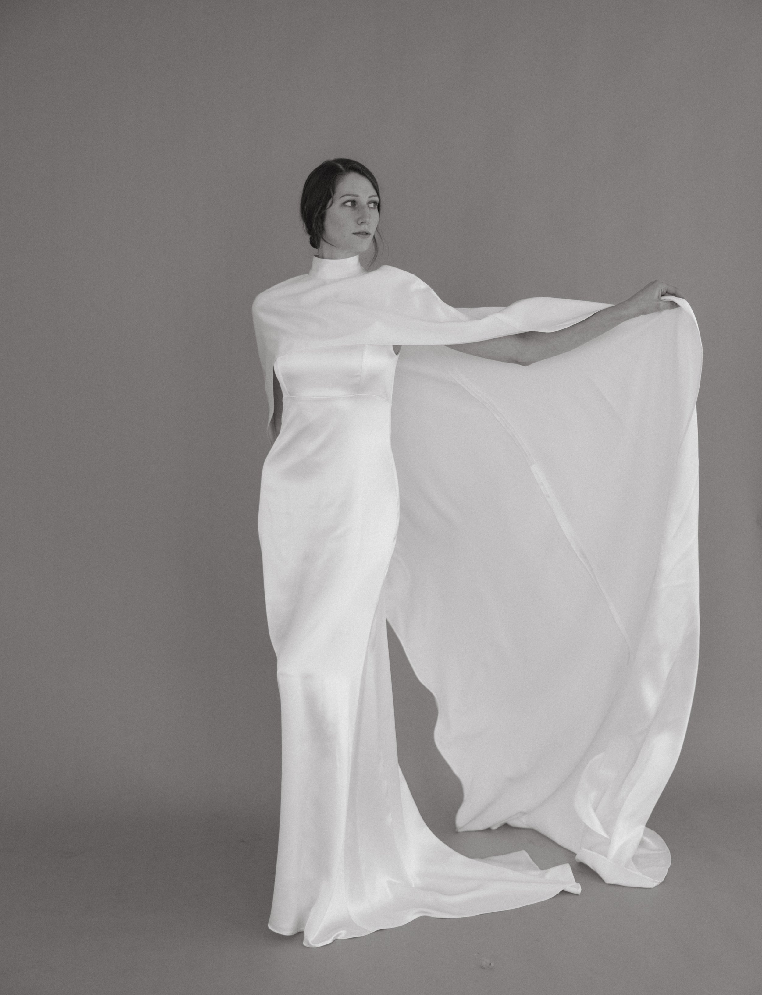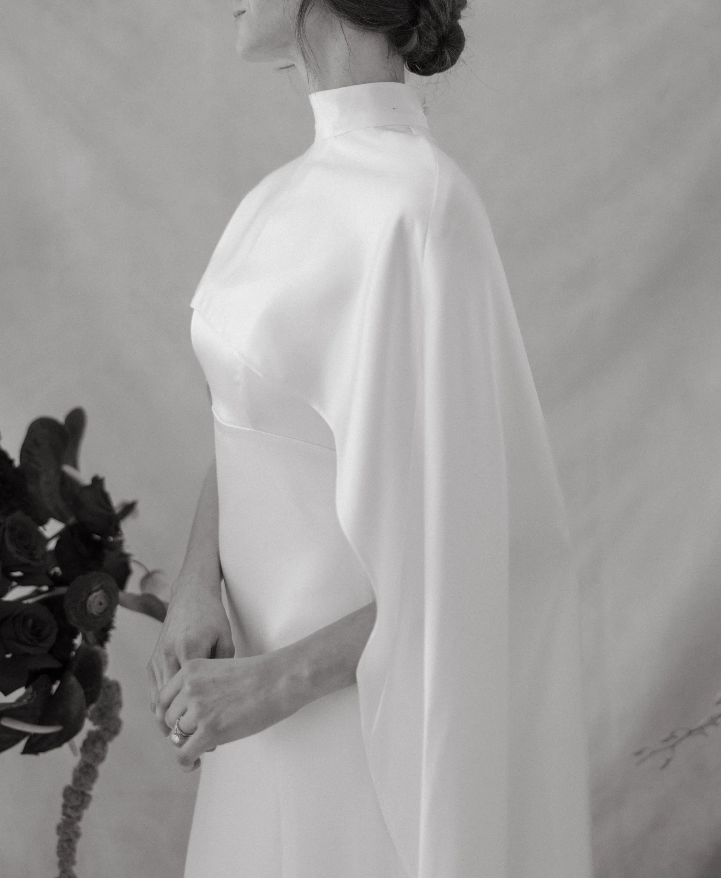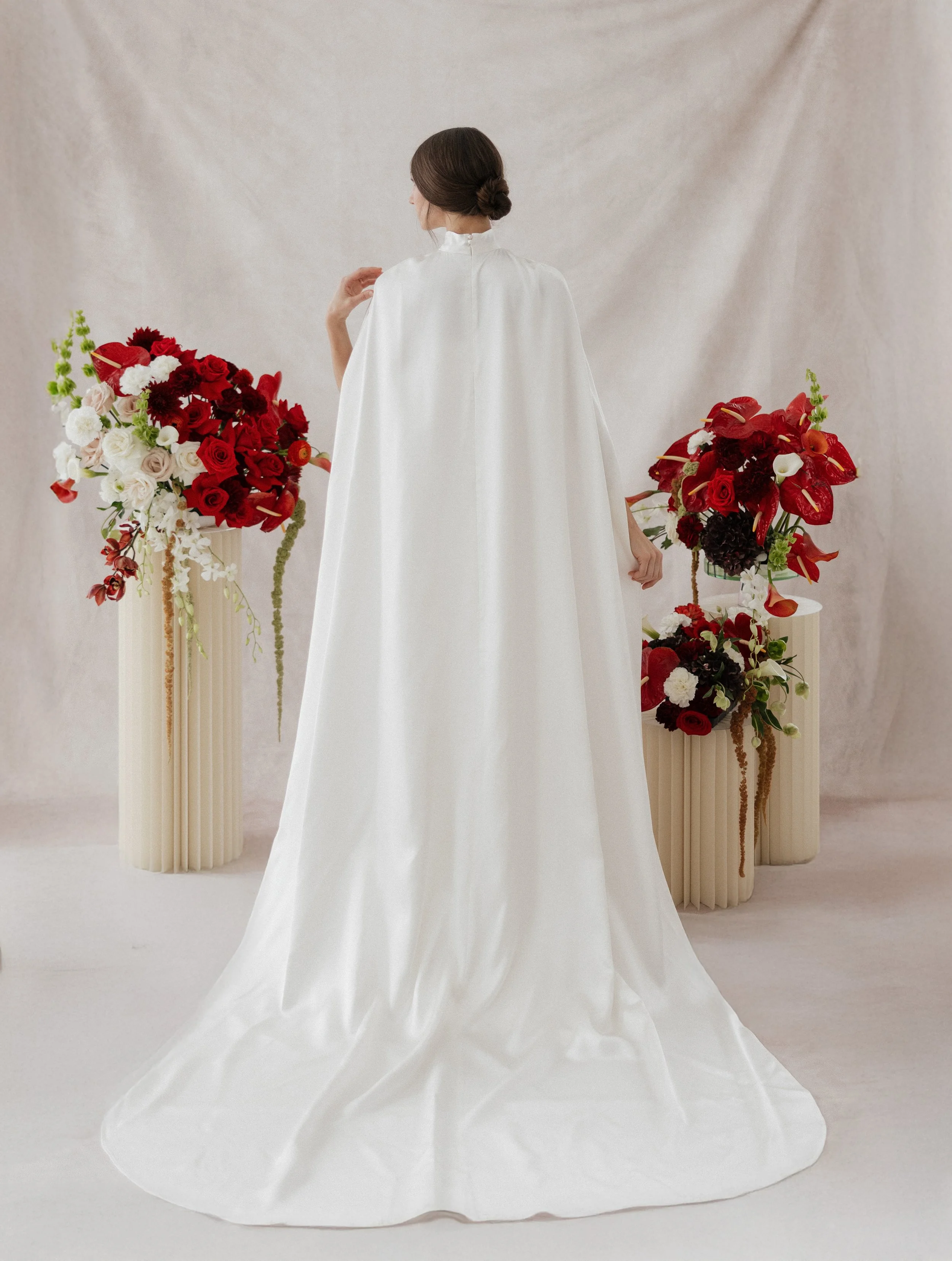 The Mantle Cape is an ivory, silk, crepe-satin bridal cape with two freshwater pearl buttons at the top of the back invisible zipper closure.