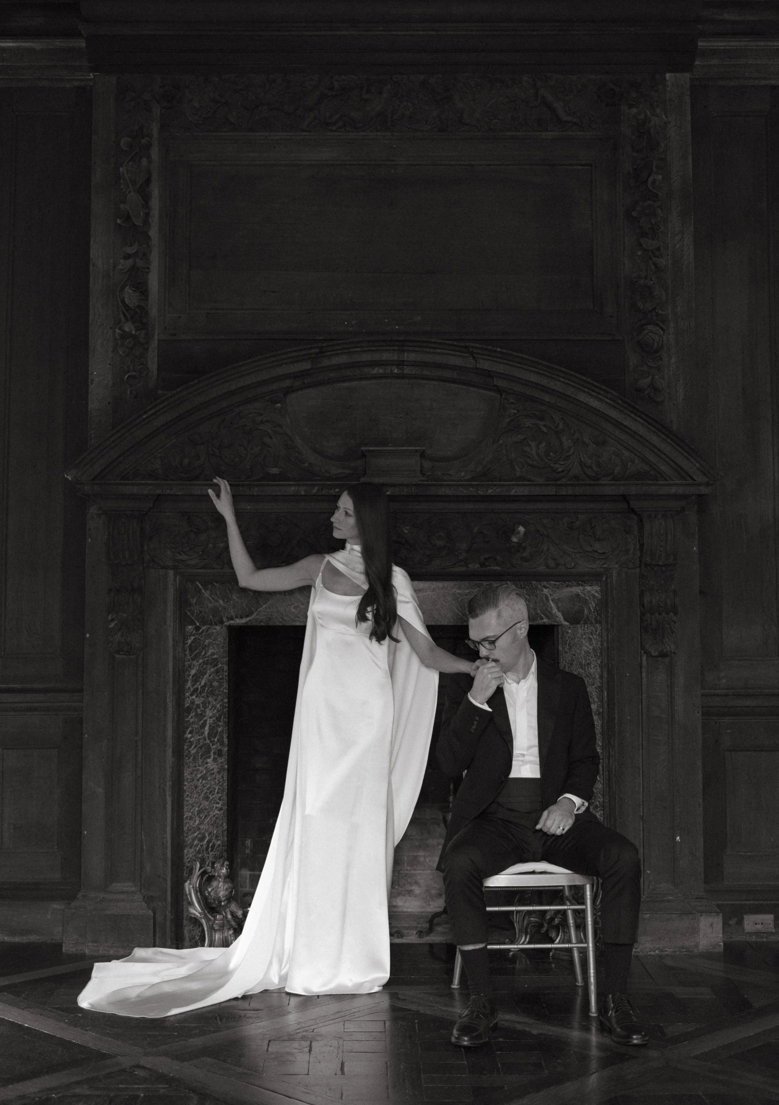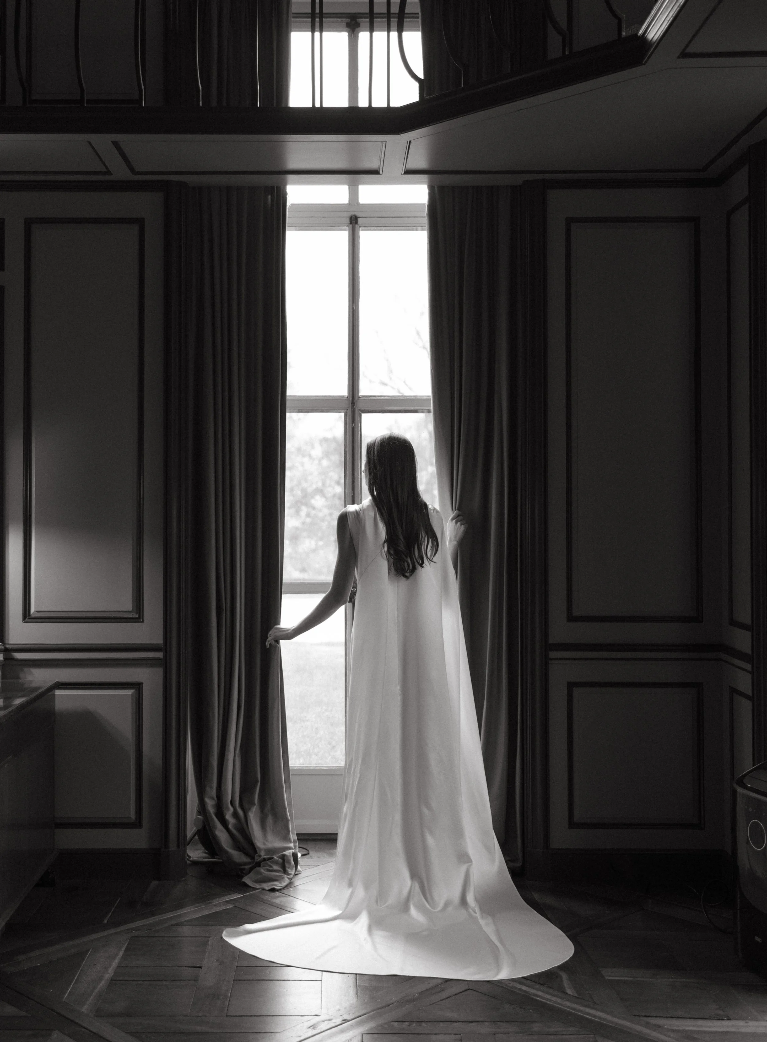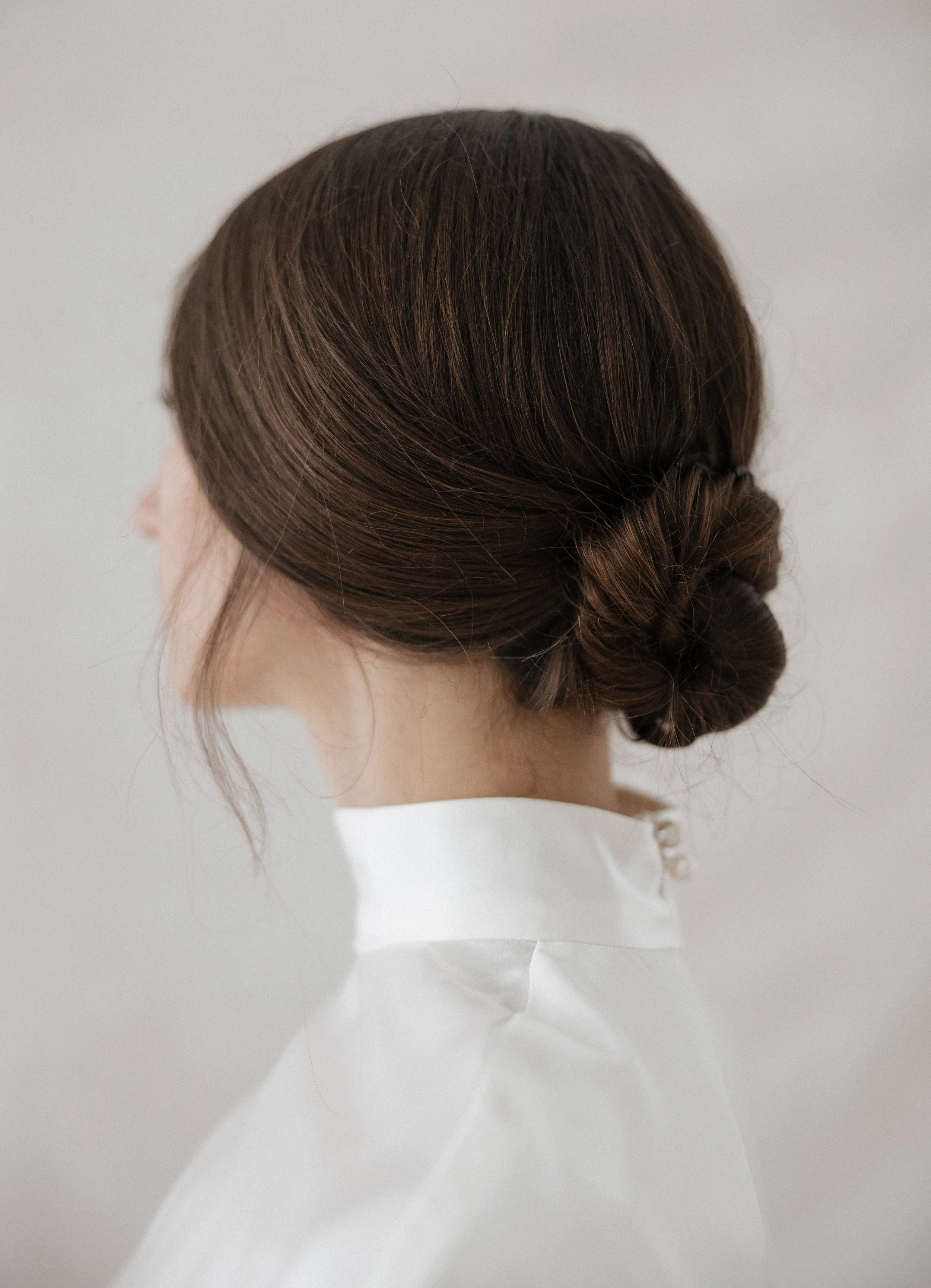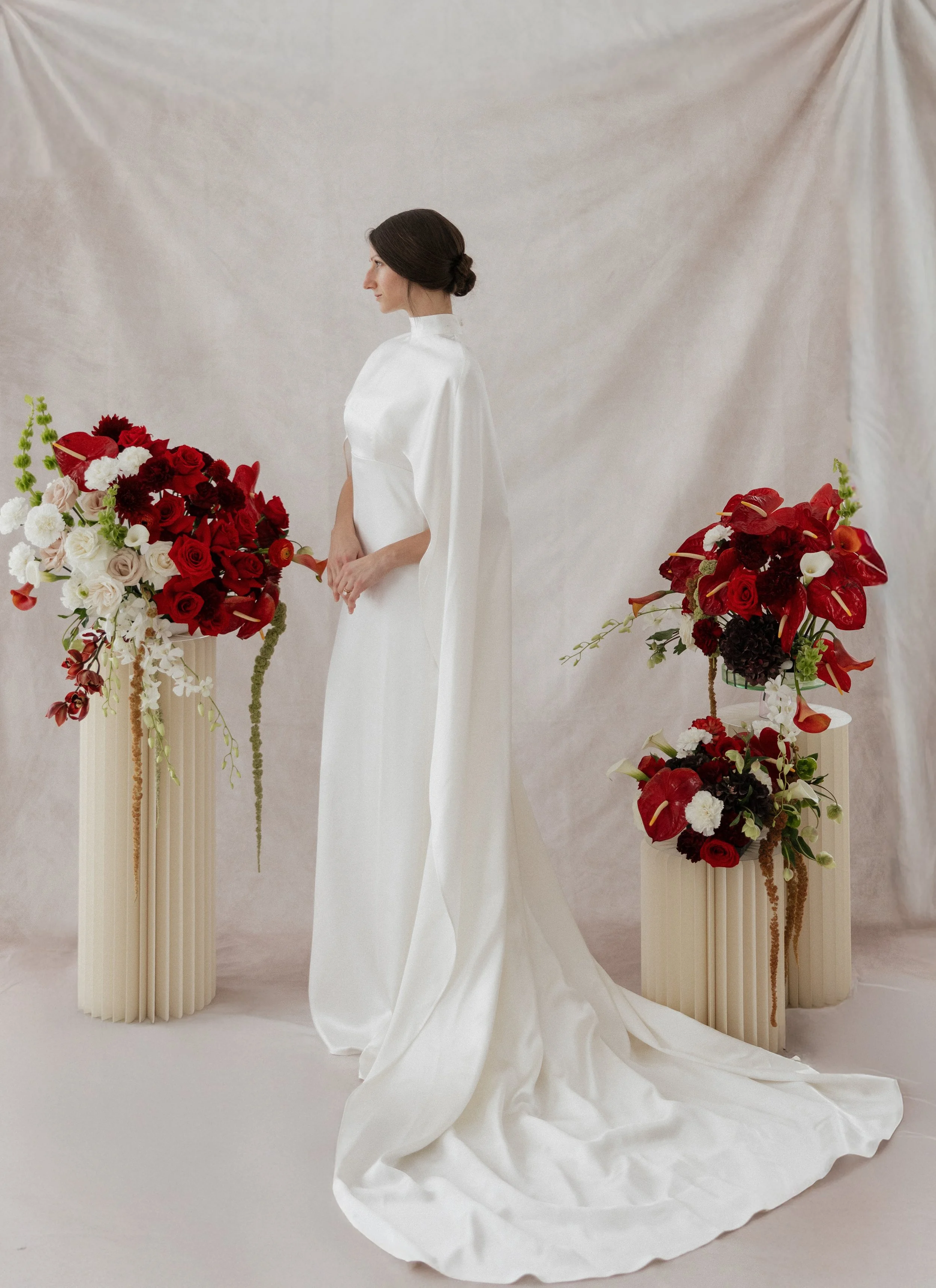 The Mantle Cape is an ivory, silk, crepe-satin bridal cape with two freshwater pearl buttons at the top of the back invisible zipper closure.